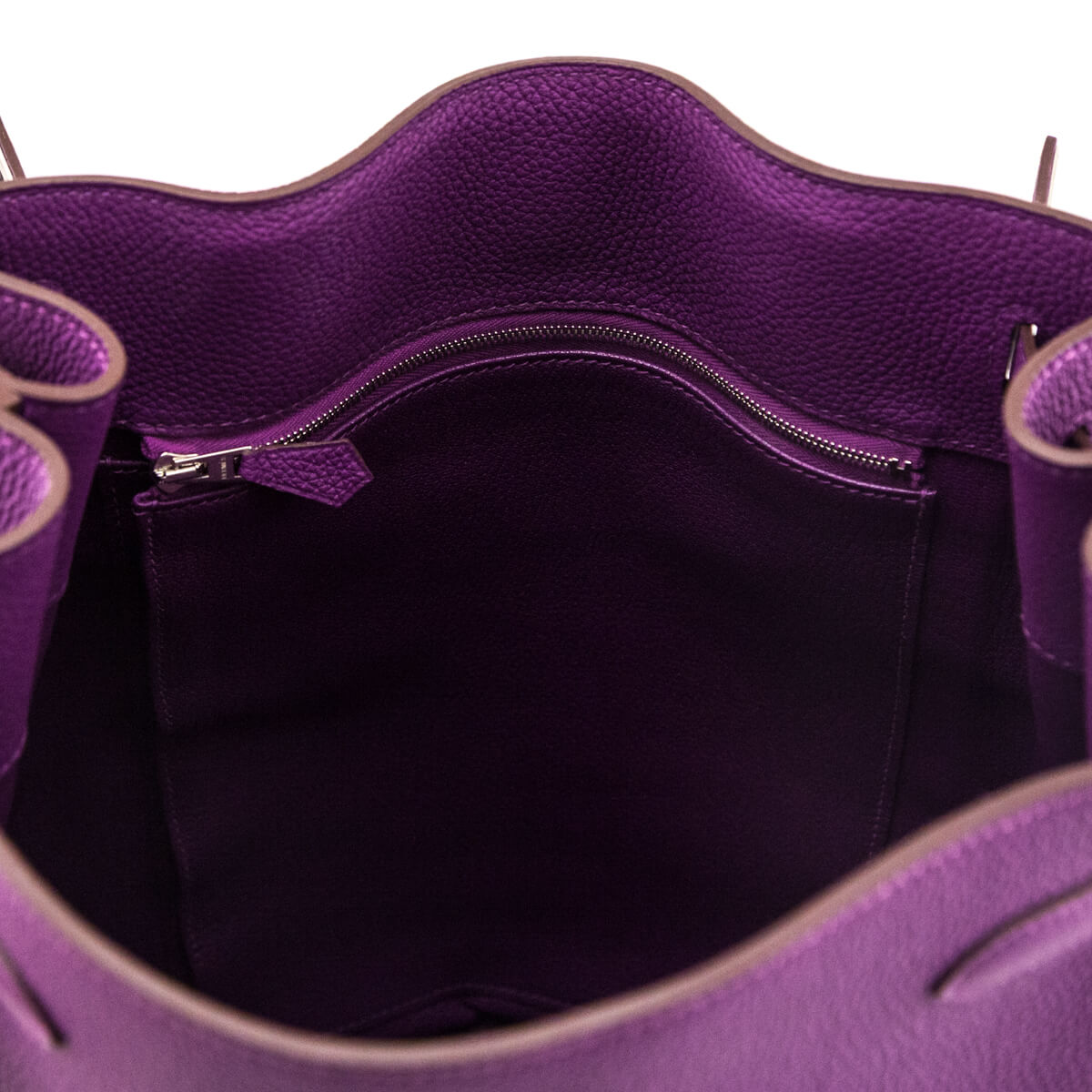 This preowned Hermes Anemone Togo So Kelly 26 Bag is crafted in richly textured Togo leather in a rich purple hue and stands tall with its vertical silhouette. The So Kelly features the palladium Kelly turn-lock closure and an adjustable shoulder strap with buckle detail for comfortable wear. The interior is lined in smooth tonal leather with a slip pocket and a zip pocket for secure organization. A rare find in one of the most desirable Hermes shades, with a sleek feminine drop that pairs beautifully with your favorite silk scarves from the French maison. Perfect for elevated everyday wear with timeless appeal.