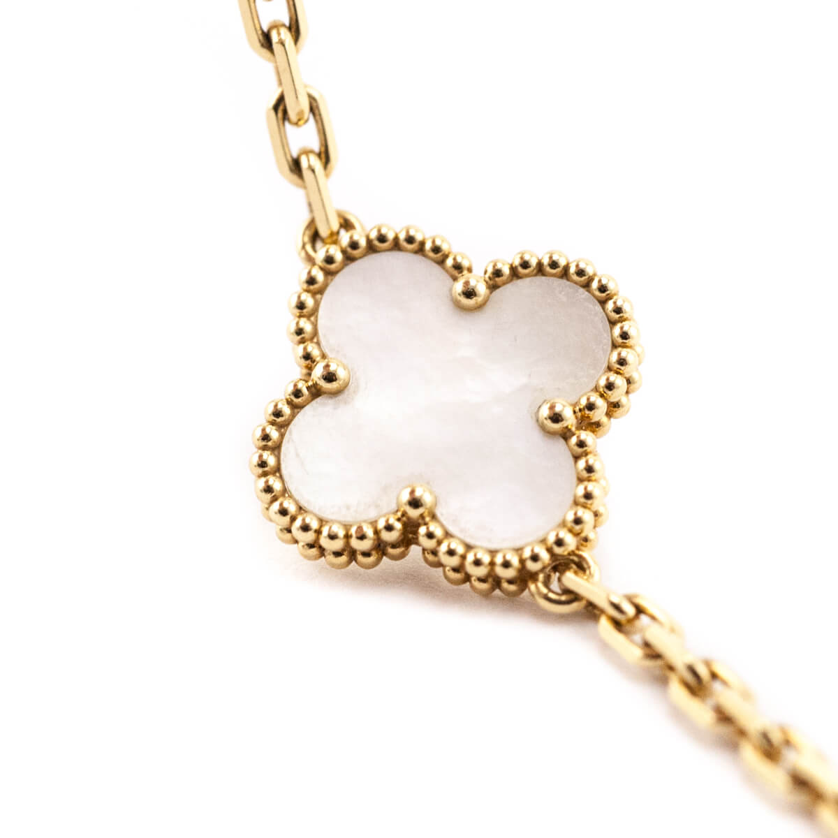 This preowned Van Cleef & Arpels 18K Yellow Gold Mother of Pearl 5 Motifs Vintage Alhambra Bracelet is a timeless piece from the renowned jeweller’s iconic Alhambra collection. Crafted in luminous 18-karat yellow gold, the delicate chain-link design is adorned with five signature four-leaf clover motifs, each framed by the collection’s distinctive beaded gold border. At the center of each motif sits a luminous mother of pearl inlay, celebrated for its soft iridescence and natural elegance. A logo-engraved lobster clasp ensures a secure and comfortable fit. Refined and instantly recognizable, this Van Cleef & Arpels bracelet is a coveted classic, perfect for everyday luxury or as an exceptional gift.