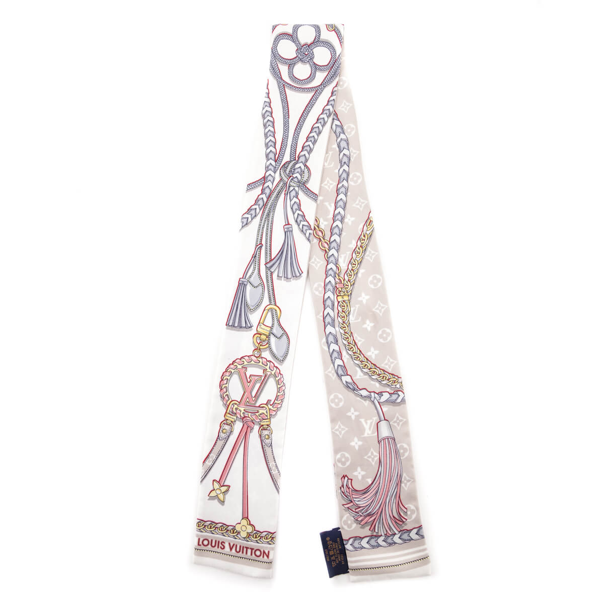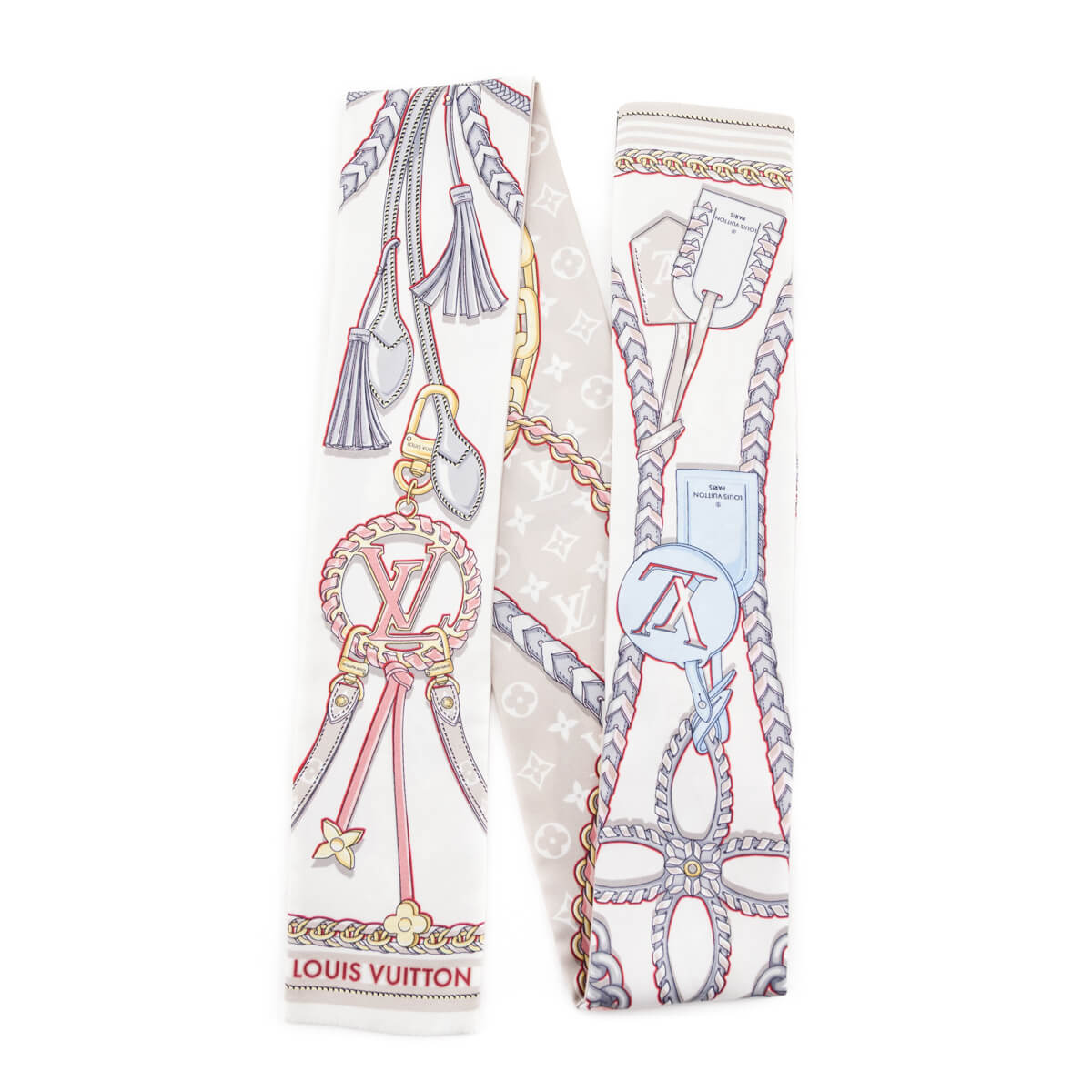 Preloved Louis Vuitton Beige Mix & Straps Silk Bandeau crafted in soft silk with a refined beige base featuring the Maison’s signature strap and hardware inspired print in pale tones of red, blue, and beige. This versatile accessory can be styled around the neck, worn in the hair, or wrapped around a handbag handle for an elevated finish. This silk Louis Vuitton bandeau will add a subtle yet distinctive touch to any look.