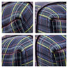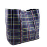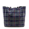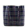 This Balenciaga Navy Plaid Double Sided Small Everyday Tote is a standout secondhand designer tote bag that is reversible. The wearer can alternate between a plaid-printed leather in navy with red, yellow, and green accents, or to a black leather exterior. This authentic Balenciaga tote features slim top handles for easy shoulder or hand carry. The black interior is spacious and open and includes a detachable leather zip pouch for added organization. Finished with subtle Balenciaga branding on the front, this preloved tote is a chic and functional choice for everyday wear.