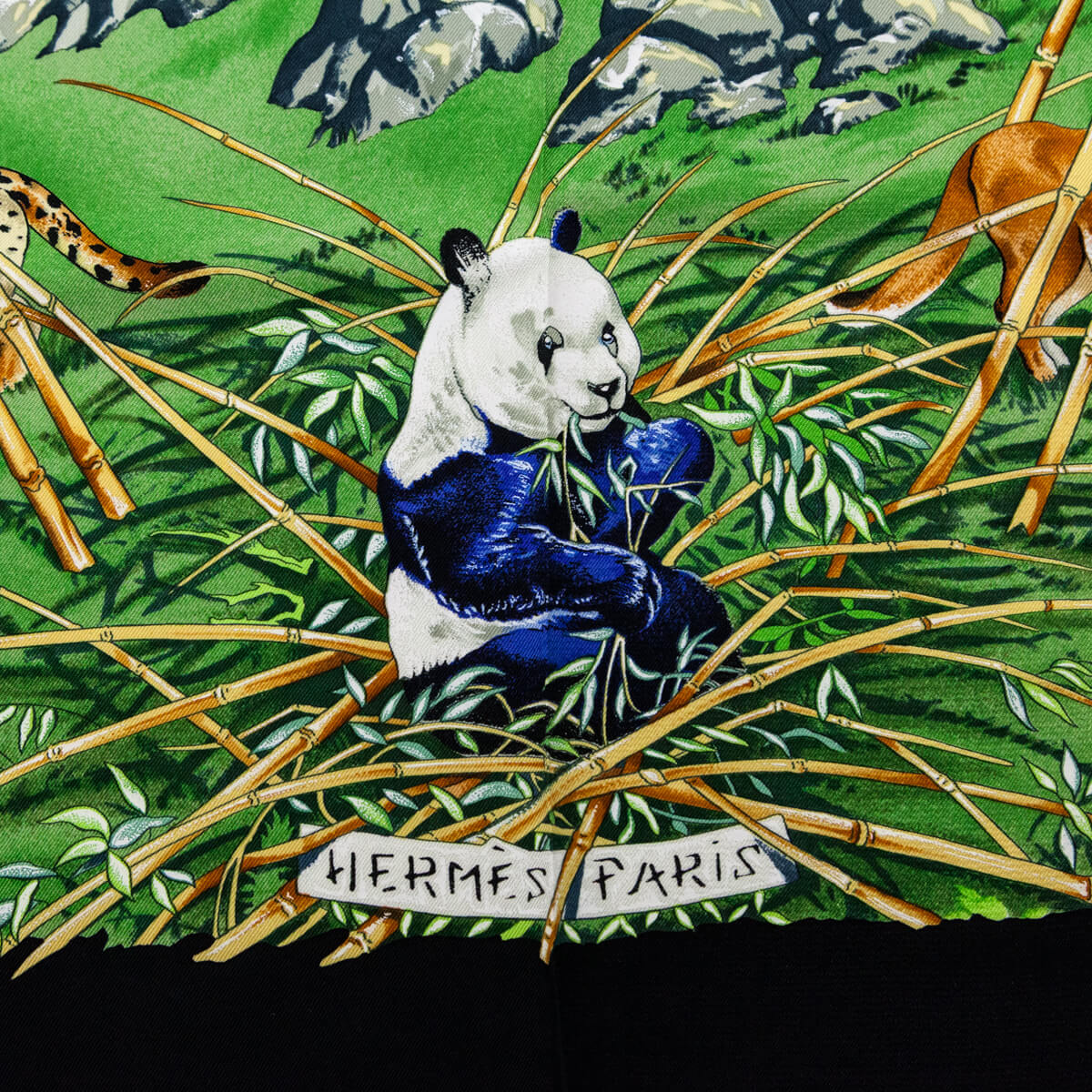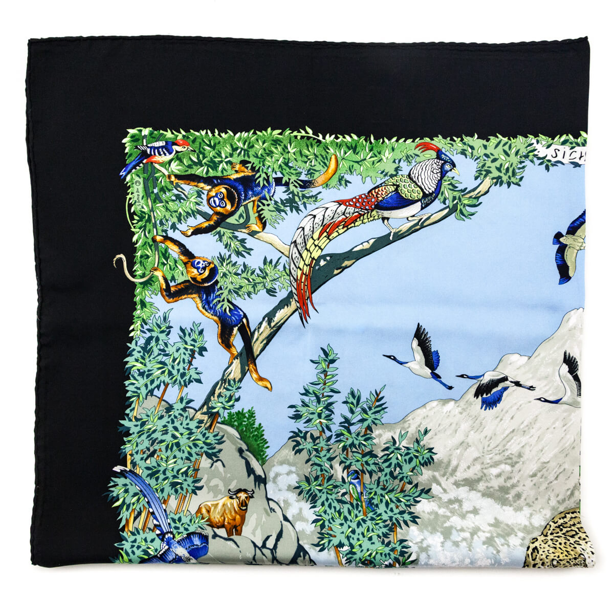 This preloved Hermes Black Sichuan Silk Scarf 90 features a detailed Sichuan-inspired design with exotic animals, lush foliage, and scenic landscapes in rich tones of green, blue, gold, and ivory, framed by a bold black border. Crafted in 100% silk with hand-rolled edges and made in France, this elegant silk carré can be styled around the neck, worn as a headscarf, or tied to a handbag for a refined and timeless Hermes look.
