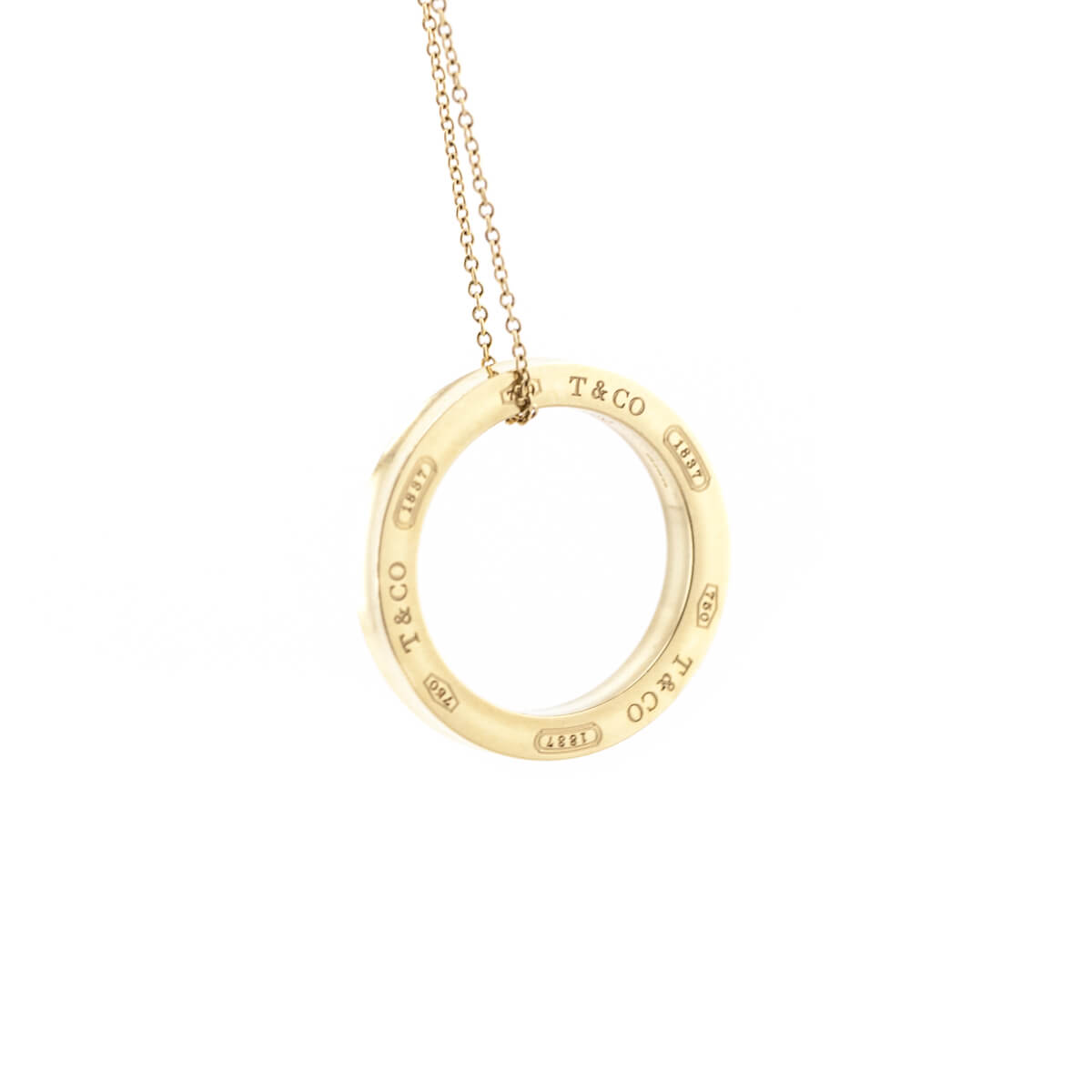 Preowned Tiffany & Co. 18K Yellow Gold 1837 Circle Pendant, a timeless and elegant design that celebrates the House’s heritage. Crafted in radiant 18K yellow gold, this iconic open circle pendant is engraved with the signature “T & Co. 1837” inscription, paying tribute to the year Tiffany & Co. was founded in New York. Suspended from a delicate gold chain with a classic spring ring clasp, the minimalist silhouette makes it perfect for everyday wear or effortless layering. Refined, recognizable, and endlessly versatile, this Tiffany piece embodies understated sophistication and enduring luxury.