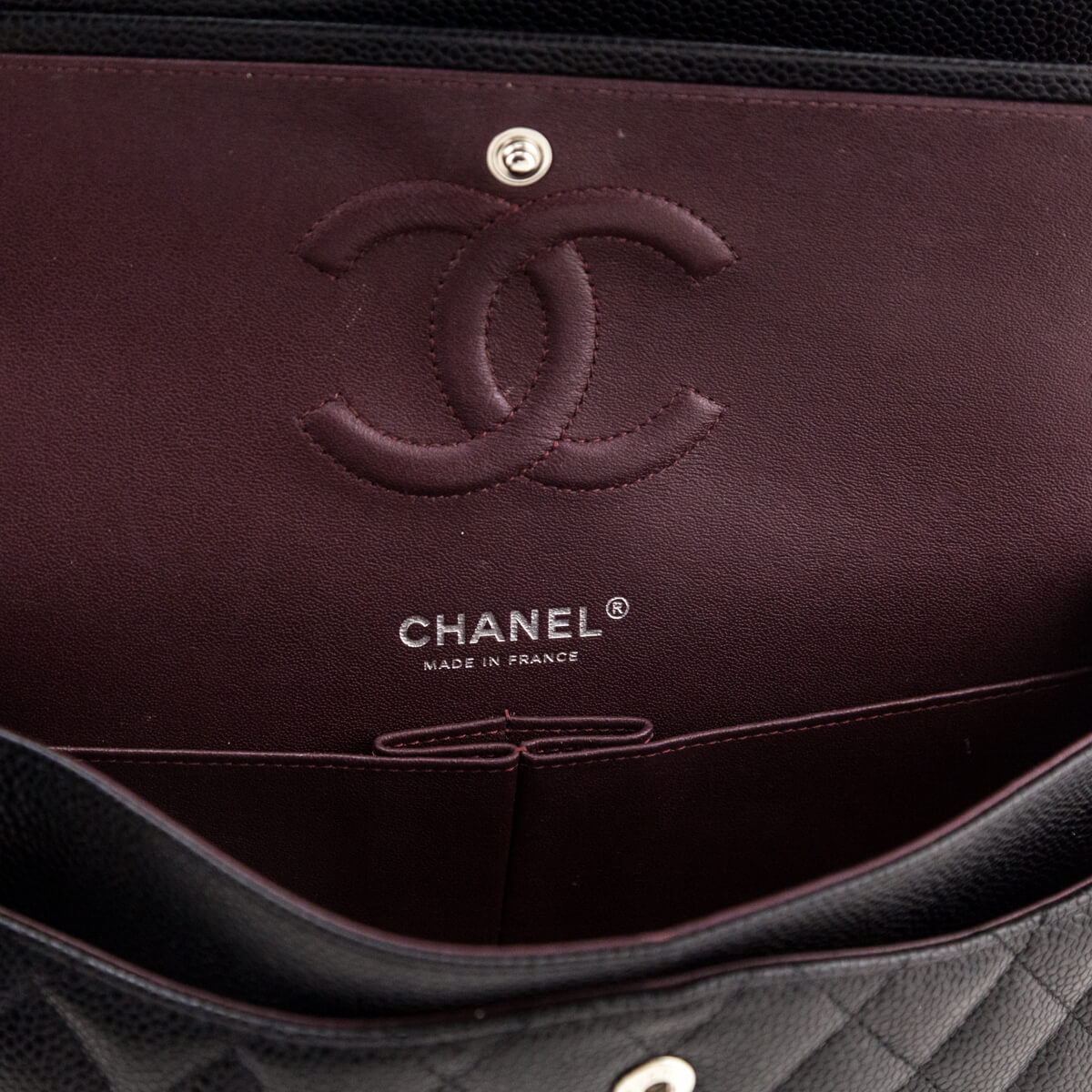 This preloved Chanel Black Caviar Quilted Medium Double Flap 2022 is the ultimate classic handbag. The black quilted caviar leather exterior pairs beautifully with silver tone hardware for subtle contrast. Carry this authentic Chanel bag with the interwoven leather and chain link strap on the shoulder at two varied lengths, either doubled for a shorter drop or worn long for a more relaxed look. A back slip pocket provides quick on the go convenience, with more secure storage behind the front flap’s interlocking CC turnlock closure. The smooth tonal leather underside of the front flap includes a narrow near hidden zip pocket, while a concealed slip pocket forms just behind the secondary inner flap when closed. Lift the inner flap to reveal the classic burgundy leather lining, featuring one semi exterior slip pocket and a main interior with two slip pockets for organization. A timeless and iconic investment piece this authentic Chanel Medium Double Flap will easily take you from day to night in luxurious style.
