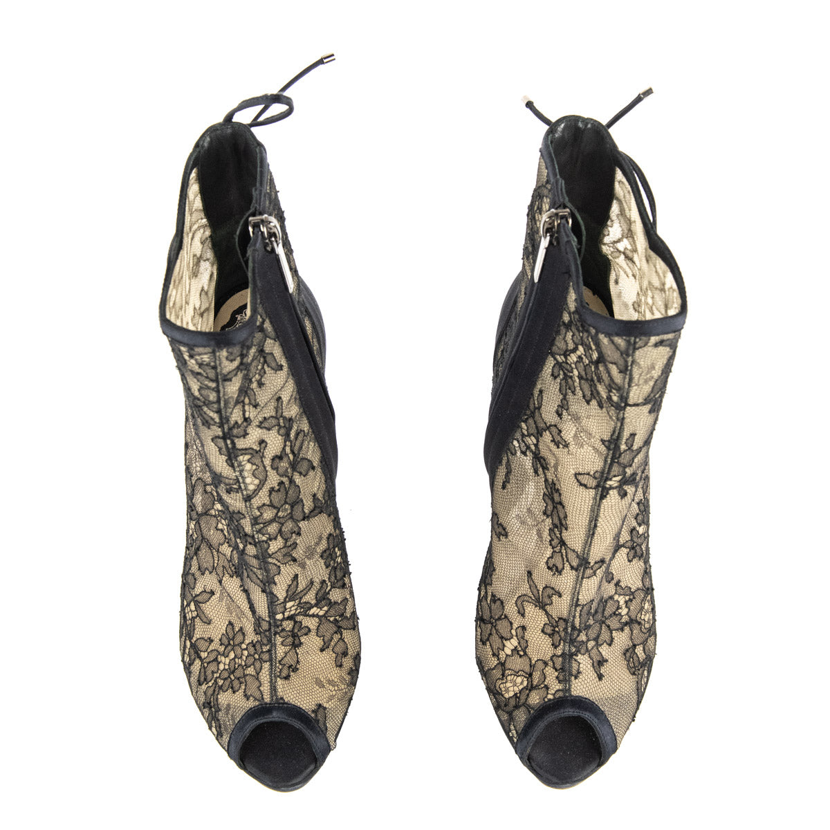 Chic and flirty, these preloved Dior Lace Booties will take your look to the next level. Made in Italy, these peep toe boots feature a delicate black floral lace exterior along with a black satin trim throughout. A scalloped black satin trim surrounds the top of each boot. The backs of these Diors are adorned with a black satin lace-up detailing, which accentuates the adjustable top knot that can be tied into a bow for lasting allure. A covered 1-inch platform and 5-inch stiletto heel grant major height for any occasion. The zip closure, embellished by gunmetal logo-debossed pull-tabs, can be found on each inner side for an extra secure fit. These authentic Dior Peep Toe Booties are waiting to transform your favorite party attire.