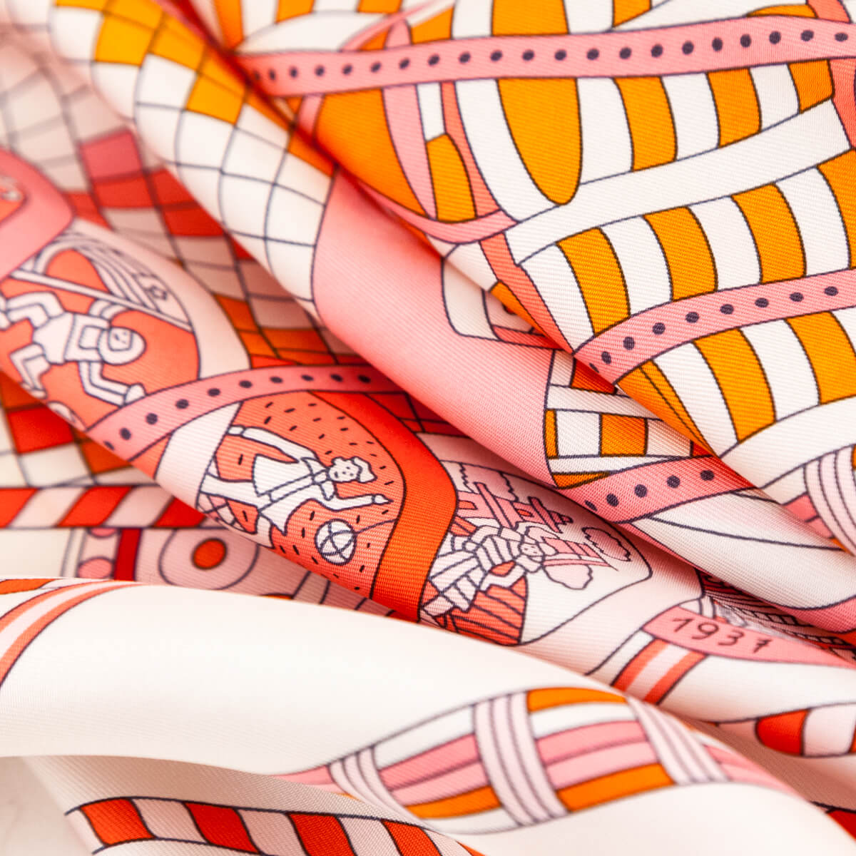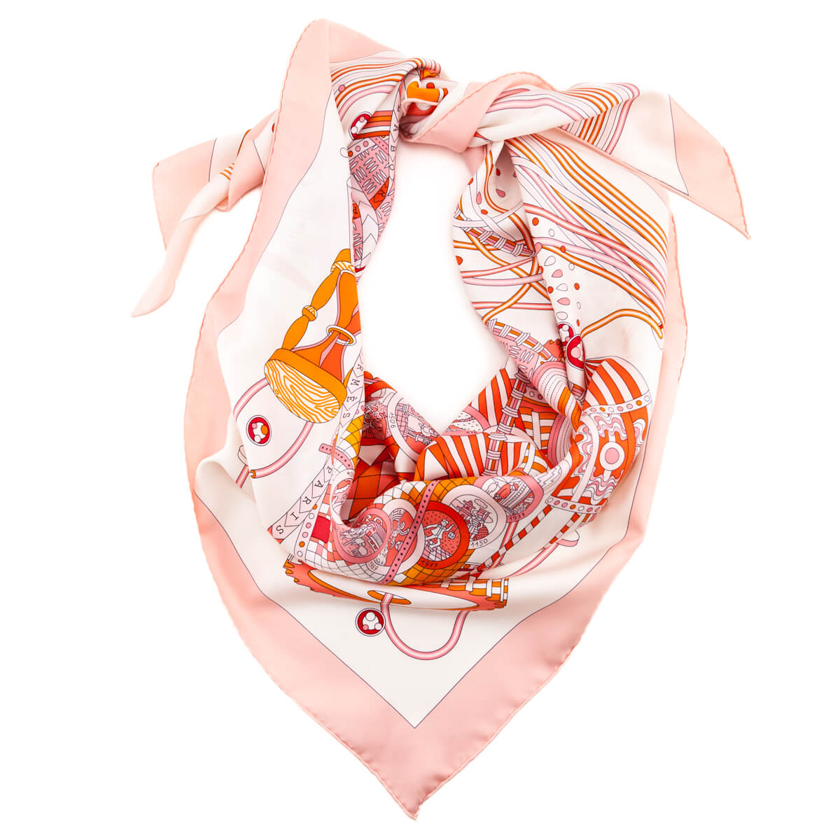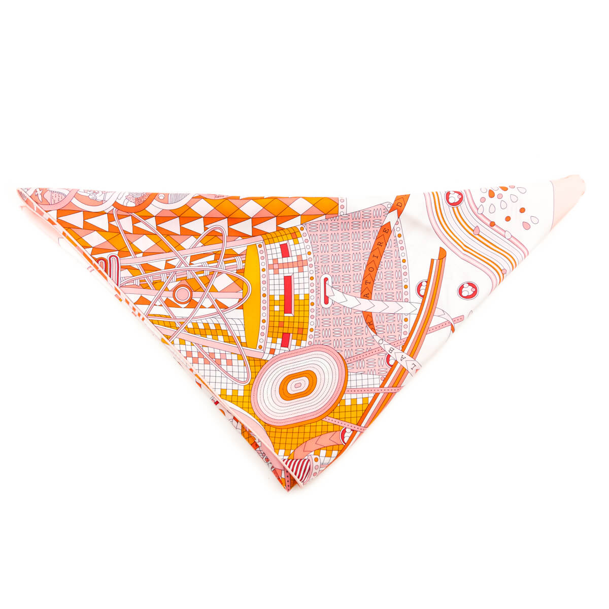 The Hermes Pink & Orange Laboratoire Du Temps Silk Giant Triangle Scarf is a striking preloved scarf crafted in luxurious twill silk. This oversized triangle scarf features hand-rolled edges and an intricate illustrated motif inspired by the concept of time, rendered in vibrant pink and orange tones. The detailed drawing and graphic composition reflect Hermes’ iconic craftsmanship and storytelling. Its generous triangular shape allows for versatile styling, wear it draped over the shoulders, wrapped as a shawl, styled as a neck scarf, or even used as a light cover-up. A refined statement piece, perfect for adding a soft pop of color to any outfit.