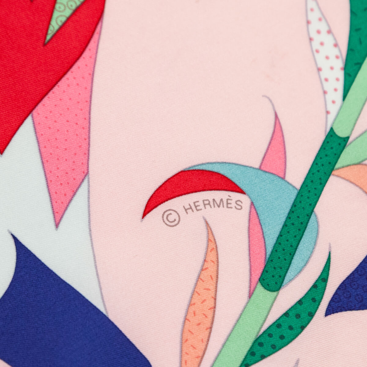 Hermes Pink Paradis De Soie Summer Weight Silk Scarf 140 is a delicate and elegant preloved shawl designed for warmer seasons. Crafted in lightweight summer silk, this scarf has a softer, airier feel than classic Hermes silk, making it ideal for spring and summer wear. Set against a soft pink background, the design features a harmonious multicolor palette in tonal shades, with floral and bird motifs that evoke a dreamy, nature-inspired paradise. The scarf is finished with hand-rolled edges in a deep dark red, a refined contrast that highlights Hermes’ exceptional craftsmanship. A refined yet fresh Hermes scarf that can be worn over the shoulders, or even as a colourful and luxurious pareo over a bathing suit.