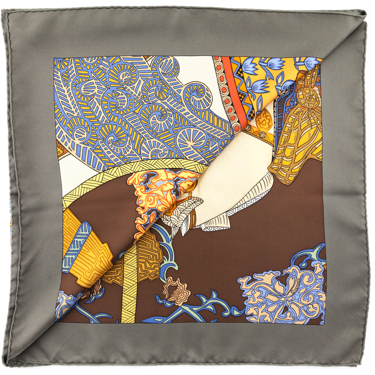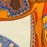 This vibrant Hermes Taupe & Orange Arts des Steppes Silk Scarf 90 celebrates nomadic artistry and tradition with a striking palette of taupe, orange, red, blue, and cream. The design depicts richly adorned horses, intricate geometric motifs, and folkloric patterns that echo Central Asian influences. Crafted in pure silk with hand-rolled edges, the scarf balances earthy tones of taupe and brown with vivid orange fields, cobalt blue accents, and golden yellow details. Versatile in styling, wear it draped over the shoulders, tied around the neck, or as an accent on your handbag, this preloved Hermes scarf embodies the house’s dedication to artistry and timeless design.