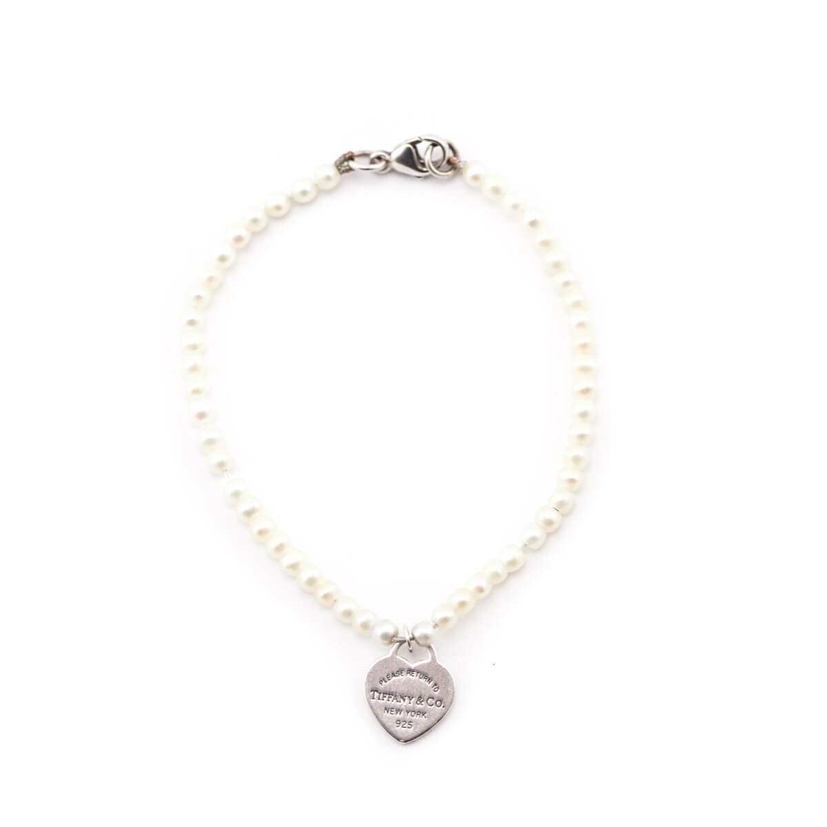 Tiffany & Co. Sterling Silver Return to Tiffany Mini Pearl Bracelet featuring a strand of delicate mini pearls accented with the iconic Return to Tiffany heart charm in sterling silver. The engraved tag reads Please Return to Tiffany & Co. New York 925 and is paired with a secure lobster clasp closure. Authentic preloved piece that combines the soft elegance of pearls with the timeless Tiffany signature charm.